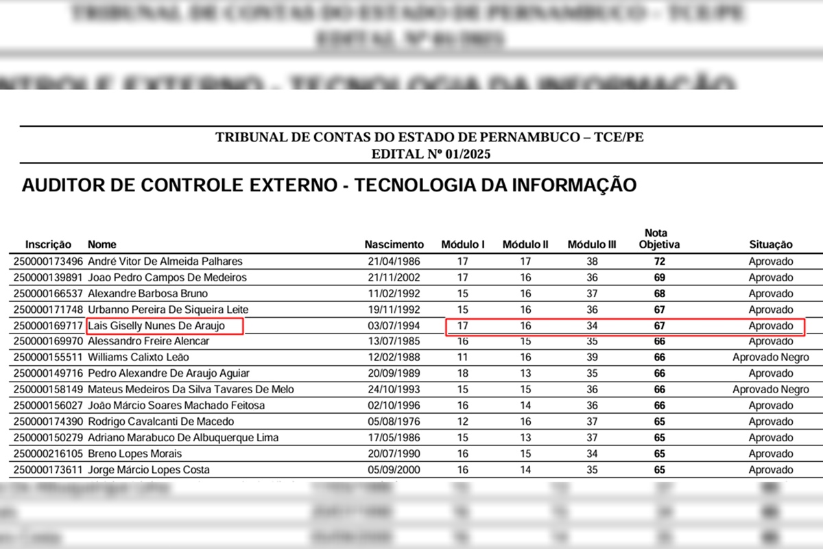 A pernambucana figura na lista de aprovados para o cargo de analista de controle externo do Tribunal de Contas de Pernambuco (TCE-PE), cujo resultado foi divulgado nesta terça-feira (6) pela Fundação Getulio Vargas (FGV).