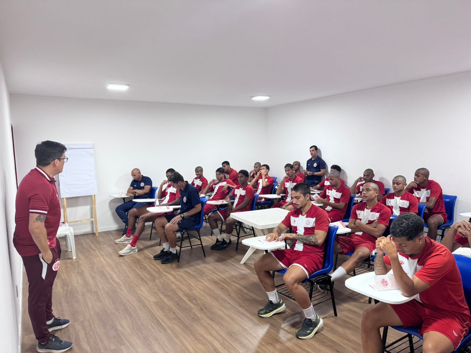 Dando continuidade às ações do Setor de Psicologia e Desenvolvimento Humano do América, o psicólogo do clube, Pedro Canísio, apresentou a nova Cartilha de Saúde Mental aos atletas, comissão técnica e staff da Base Alvirrubra que irão representar o clube na Coinha. Formar jogadores vai além do campo. É sobre preparar pessoas, fortalecer vínculos e cuidar de quem carrega o escudo do Rubro desde a base. O América faz parte do Grupo 3, com sede em Tanabi, e estreia no dia 3 de janeiro, contra o Goiás. Depois enfrenta o Tanabi, dia 6 e encerra a primeira fase, espero que classificado, contra o Sobradinho/DF, dia 9.