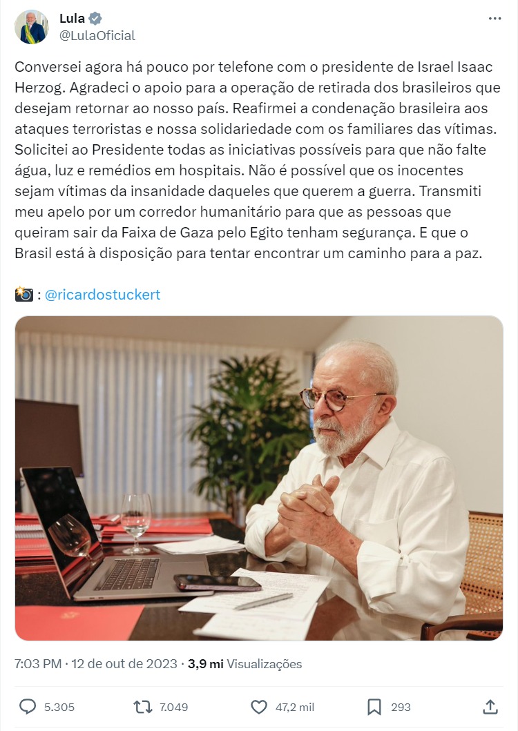Além disso, fez um apelo pela criação de um corredor humanitário que possibilite a saída em segurança dos brasileiros que vivem em Gaza. A ideia do Itamaraty é que o resgate ocorra pelo Egito.