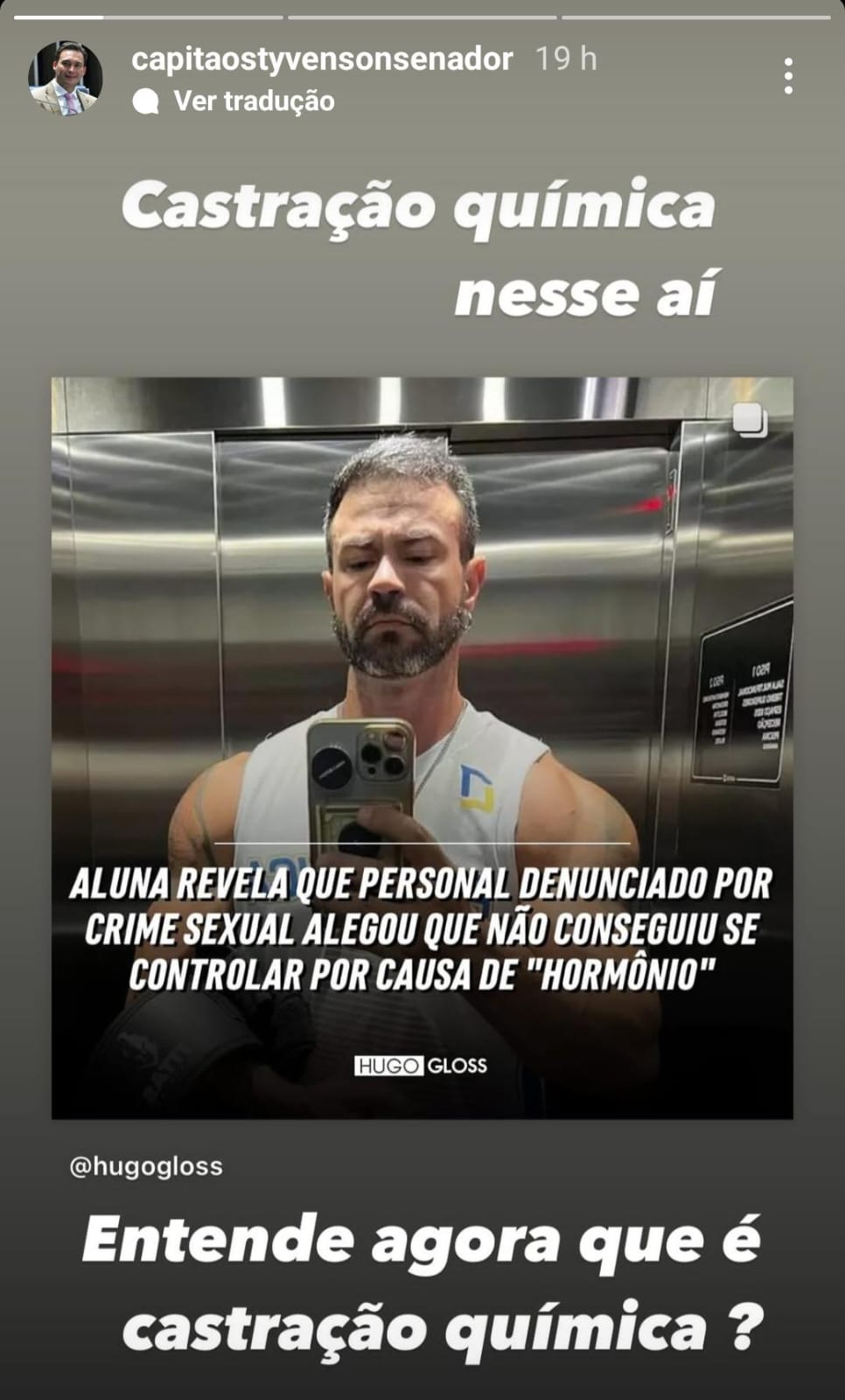 O senador Styvenson Valentim, do PODEMOS-RN, comentou no seu perfil no Instagram, a história do personal trainer Bruno Fidelis, suspeito de importunação sexual contra alunas durante avaliações físicas. Em mensagem divulgada por uma das vítimas, o rapaz afirmou que "não conseguia se controlar", por causa dos hormônios que estava tomando.