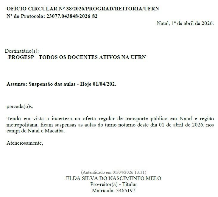 “Tendo em vista a incerteza na oferta regular de transporte público em Natal e região metropolitana, ficam suspensas as aulas do turno noturno deste dia 01 de abril de 2026, nos campi de Natal e Macaíba”, diz o ofício assinado pela pró-reitora Elda Silva do Nascimento Melo.
