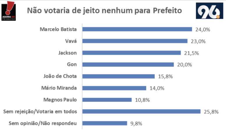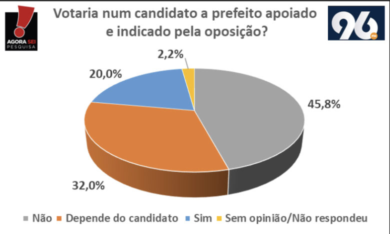 No levantamento feito pelo instituto AgoraSei, consta também o índice da população que não votaria em um candidato apoiado pela oposição.