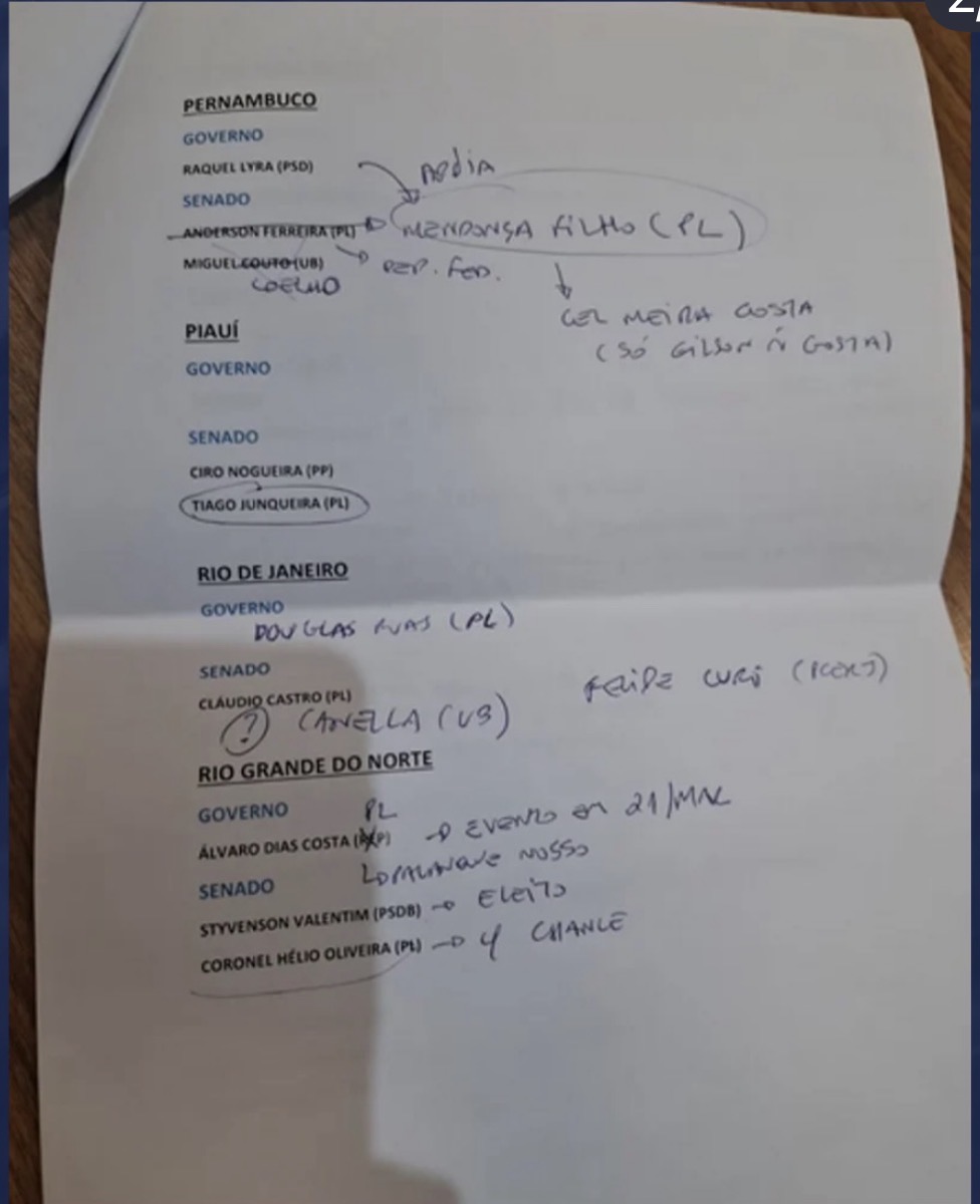 O documento, intitulado “situação nos estados”, foi obtido por jornalistas durante entrevista coletiva na sede do partido. Flávio confirmou a autoria das anotações, mas afirmou que parte do conteúdo registra sugestões apresentadas em reuniões internas com lideranças da legenda, incluindo o presidente do partido.