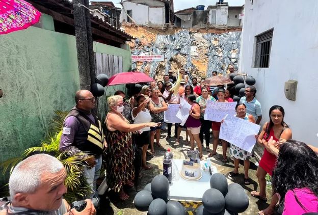 Na data em que o desabamento na Rua Macassita, no conjunto Pirangi, completou um mês, os moradores instalaram faixas com cobranças e levaram um bolo de "merversário" ao local.