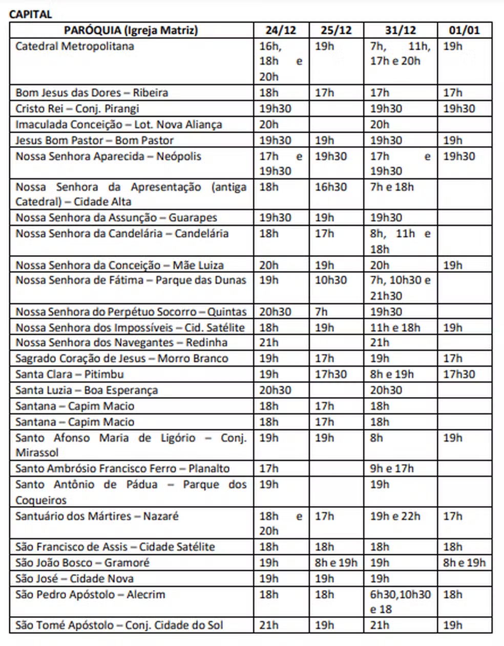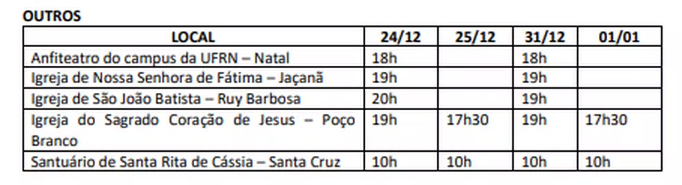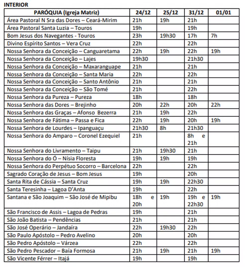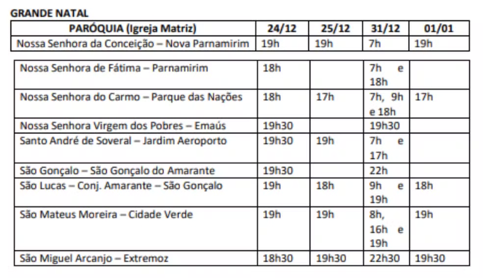 A Arquidiocese de Natal divulgou os horários de missas de celebrações e missas de Natal e Ano Novo nas igrejas e paróquias do Rio Grande do Norte. (veja horários detalhados nas imagens mais abaixo).