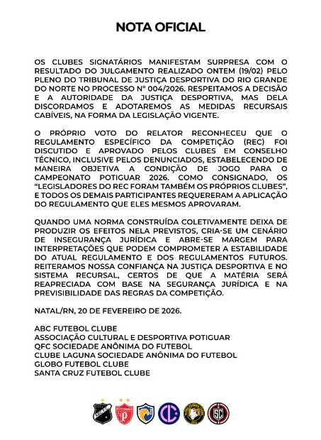 Nota conjunta dos clubes contra decisão do Pleno do TJD