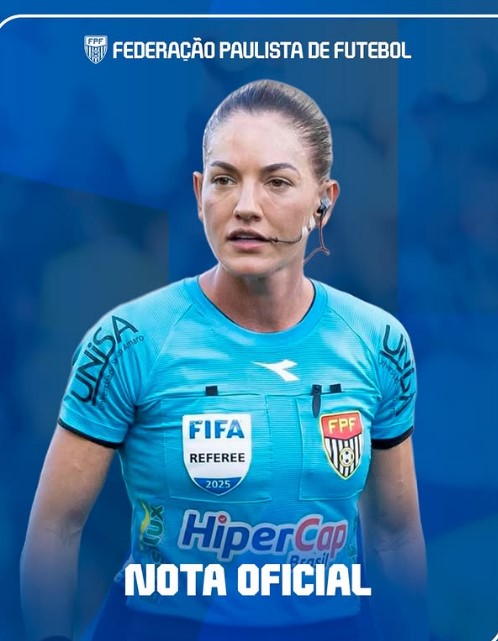 Daiane Muniz é uma árbitra FPF/CBF/FIFA da mais alta qualidade técnica, correta e de caráter. A FPF reforça todo apoio a Daiane e a todas as mulheres que atuam ou desejam atuar em qualquer área do futebol. Nosso trabalho diário é para garantir que o futebol seja um ambiente seguro e justo para todas as mulheres.