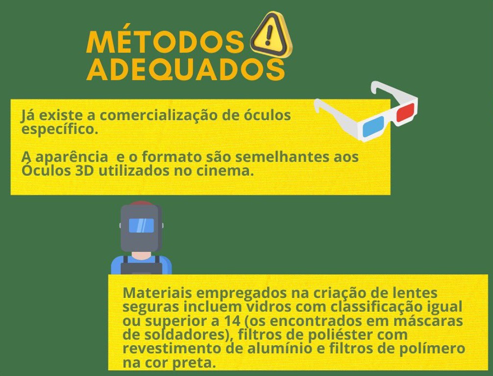 É importante lembrar que é extremamente perigoso que se use alternativas, como filmes fotográficos ou radiografias, óculos escuros comuns (mesmo que se use vários ao mesmo tempo) ou lentes de câmeras, mesmo pela tela de um celular.