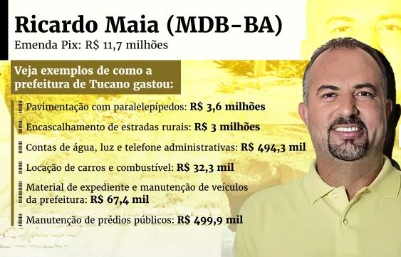 O pai do prefeito desponta na indicação de valores para Tucano, com R$ 11,7 milhões em uma única emenda Pix. Desse total, a CGU descobriu que a cidade pulverizou mais de R$ 1 milhão para bancar impostos, manutenção e contas básicas da administração municipal. Materiais de escritório, limpeza, aluguel de carros e combustível para o gabinete de Ricardo Maia Filho (MDB-BA) não ficaram de fora.