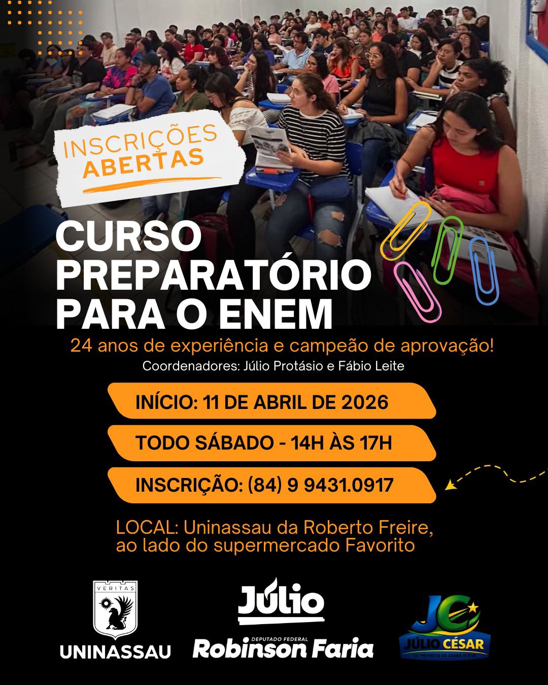Já o curso preparatório para o ENEM começa no dia 11 de abril e será realizado aos sábados, das 14h às 17h. As aulas terão foco na revisão de conteúdos, resolução de questões e estratégias para a prova.