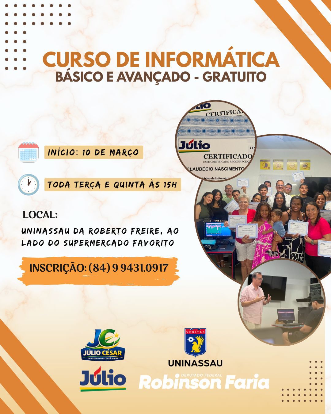 O curso de informática terá início no dia 10 de março, com aulas às terças e quintas-feiras, das 15h às 17h. A formação é voltada para a capacitação básica e prática, oferecendo conhecimentos essenciais para quem deseja melhorar as oportunidades profissionais.