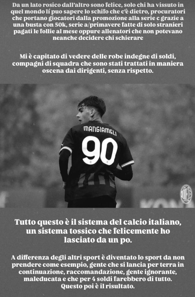 Jogador da base do Milan até os 19 anos, o atacante Federico Mangiameli (21) 🇮🇹, hoje no amador Club Milano, relacionou, em seu Instagram, o fracasso da seleção italiana aos bastidores obscuros do futebol italiano: