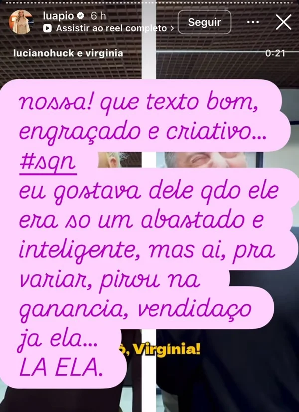 A atriz Luana Piovani voltou a criticar publicamente a influenciadora Virginia Fonseca e, desta vez, também direcionou ataques ao apresentador Luciano Huck. A reação ocorreu após Huck gravar, nesta quinta-feira (12), um vídeo ao lado da nova rainha de bateria da Grande Rio para anunciá-la como convidada do programa Domingão.