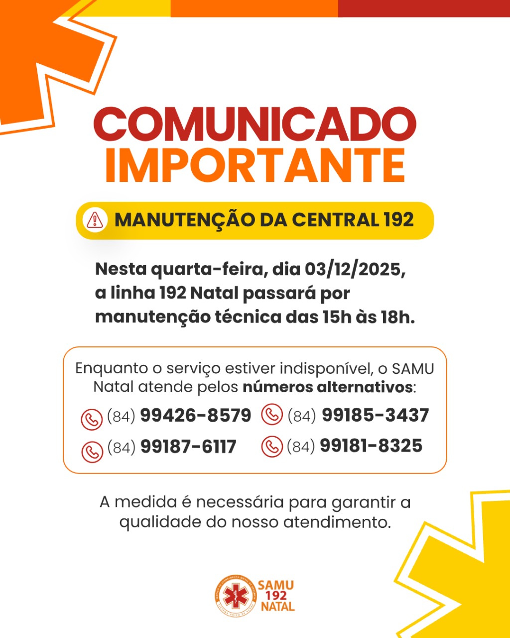 O SAMU 192 Natal informou que o sistema de atendimento telefônico 192 ficará indisponível nesta quarta-feira 3, das 15h às 18h, devido a uma manutenção programada.