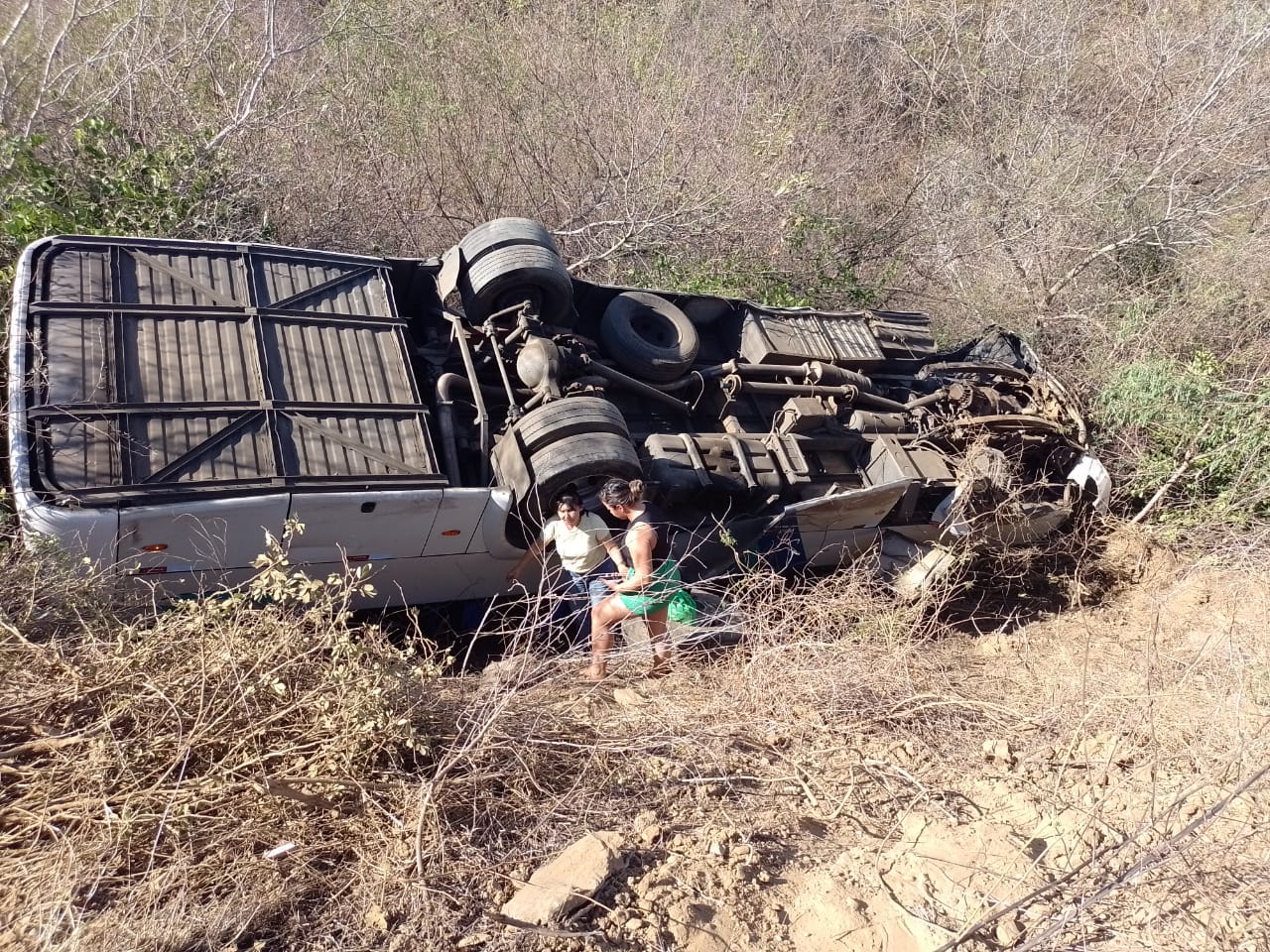 Os militares relataram que o micro-ônibus estava na parte baixa de uma ribanceira, apresentando sinais de capotamento.