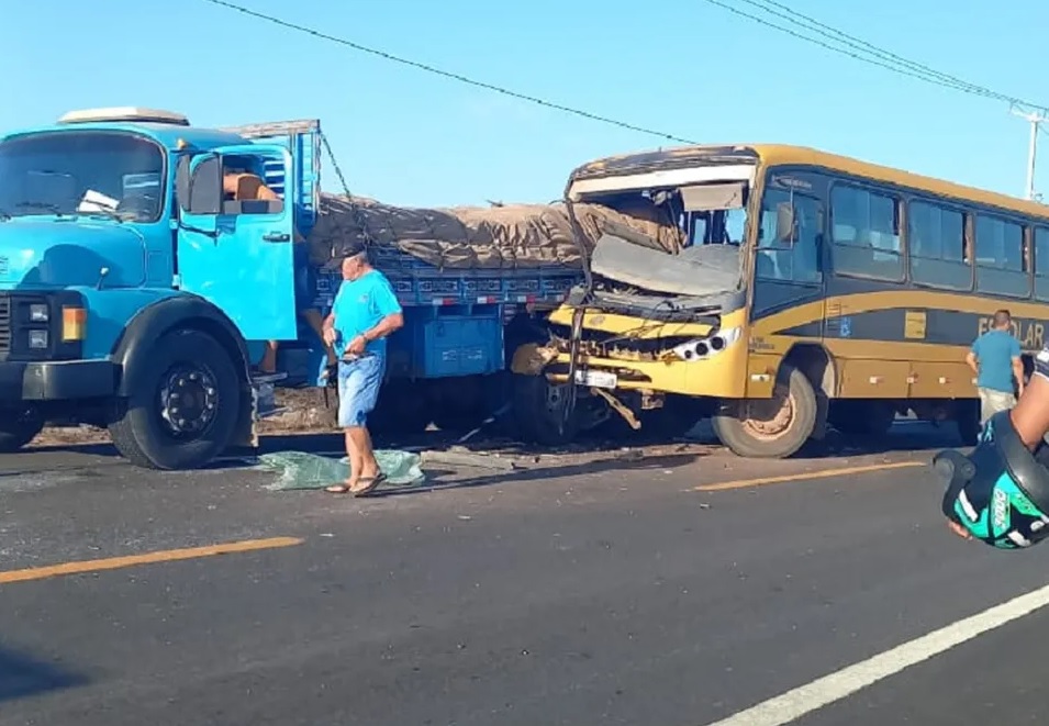 Um ônibus escolar ficou com a frente destruída após colidir em uma caminhão que estava parado no acostamento da RN-110 em Areia Branca, região Oeste potiguar, na manhã desta terça-feira (12).