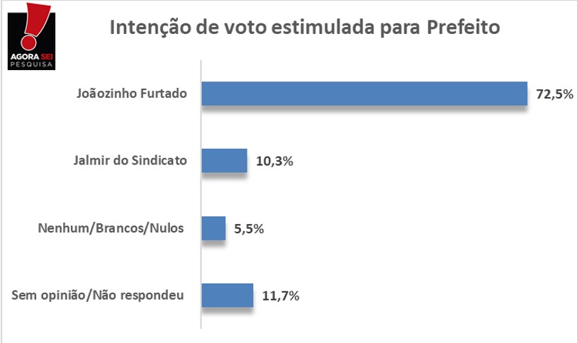 Na intenção de voto estimulada, Joãozinho Furtado é o preferido dos entrevistados, com 72,5%, enquanto Jalmir do Sindicato tem 10,3%.