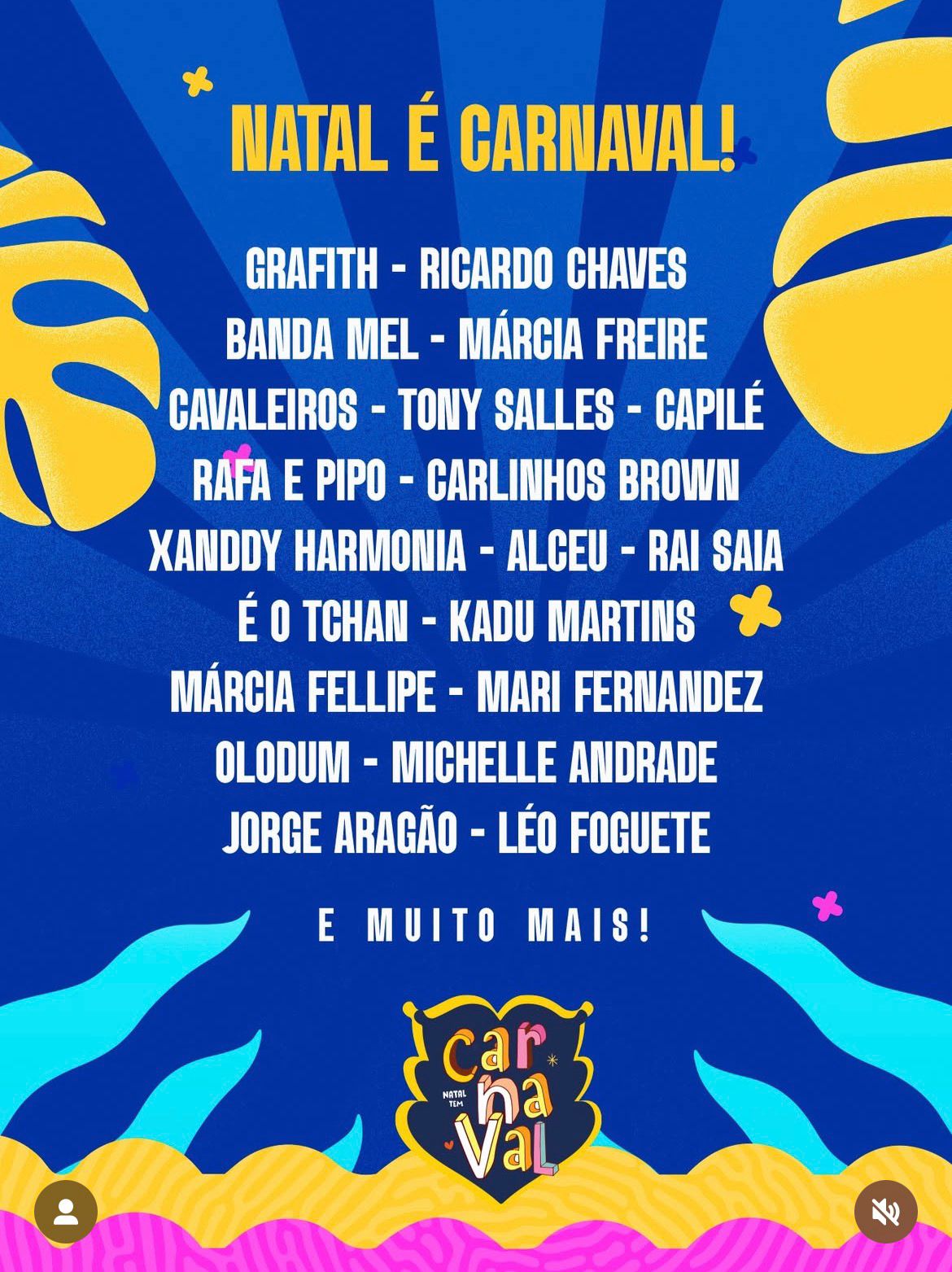 Entre os nomes confirmados estão Grafith, Ricardo Chaves, Banda Mel, Márcia Freire, Cavaleiros do Forró, Tony Salles, Capilé, Rafa e Pipo, Carlinhos Brown, Xanddy Harmonia, Alceu Valença, Raí Saia Rodada, É o Tchan, Kadu Martins, Olodum, Michelle Andrade, Jorge Aragão, Léo Foguete e muito mais.
