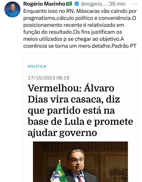 "As máscaras vão caindo" por "pragmatismo, cálculo político ou conveniência", comentou Rogério Marinho no Twitter (atual X), respondendo a notícia sobre o "vermelhou" de Álvaro Dias na frente de ministros de Lula nesta segunda-feira (16).