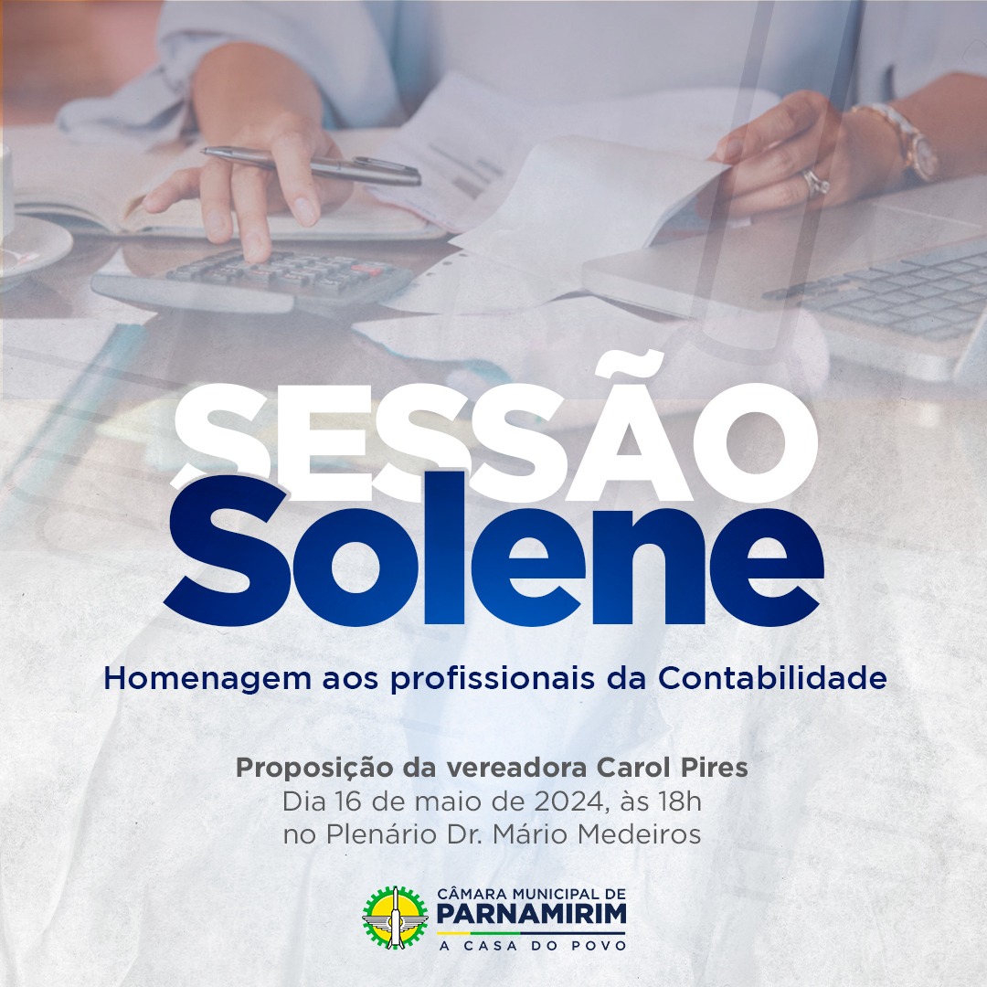 A Câmara de Parnamirim realizará sessão solene em homenagem aos profissionais da contabilidade, na próxima quinta-feira, 16, às 18h. O evento é uma proposição da vereadora Carol Pires e ocorre no Plenário Dr. Mário Medeiros.