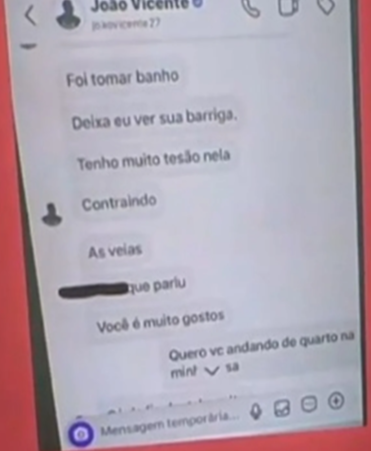 “Foi tomar banho? Deixa eu ver sua barriga, tenho muito tesão nela, contraindo as veias. P*ta que pariu, você é muito gostosa”, pediu.
