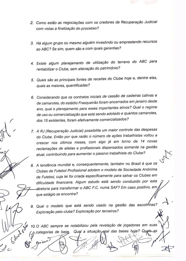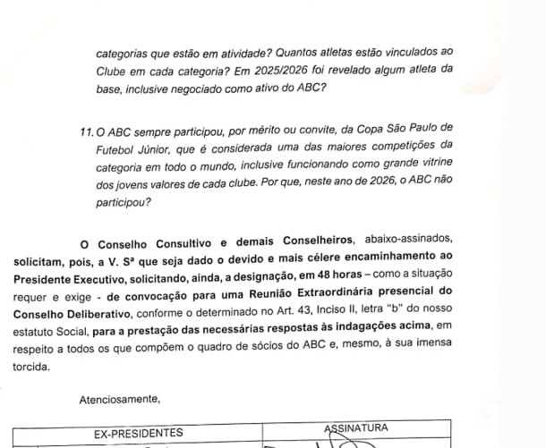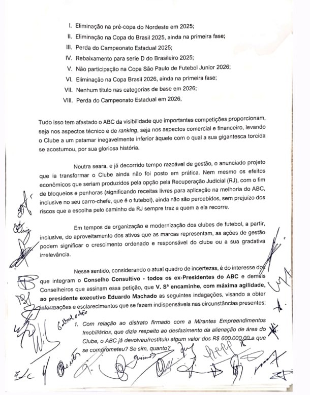 No documento, o grupo pede justificativas sobre as eliminações em competições e principalmente uma atualização sobre a situação financeira, incluindo a Recuperação Judicial.