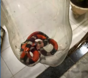 Ao se aproximar para averiguar a situação, viu que se tratava de uma cobra coral, que estava na varanda da casa.