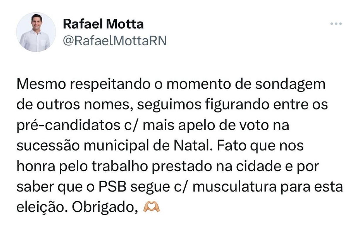 "Mesmo respeitando o momento de sondagem de outros nomes, seguimos figurando entre os pré-candidatos com mais apelo de voto na sucessão municipal de Natal. Fato que nos honra pelo trabalho prestado na cidade e por saber que o PSB segue com musculatura para esta eleição", afirmou Rafael Motta pelo Instagram.