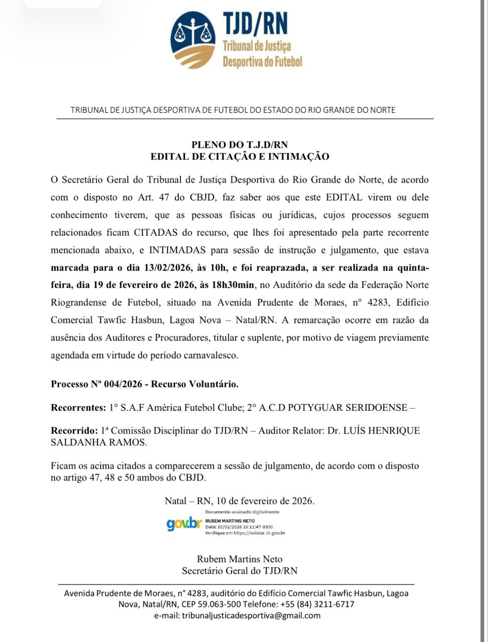 O julgamento do recurso envolvendo América e Potyguar Seridoense, no caso dos jogadores irregulares, foi adiado pelo Pleno do Tribunal de Justiça Desportiva do Rio Grande do Norte (TJD-RN). Inicialmente marcado para a sexta-feira (13), às 10h, o processo foi remarcado para o dia 19 de fevereiro, às 18h30, no auditório da Federação Norte-rio-grandense de Futebol, em Natal.