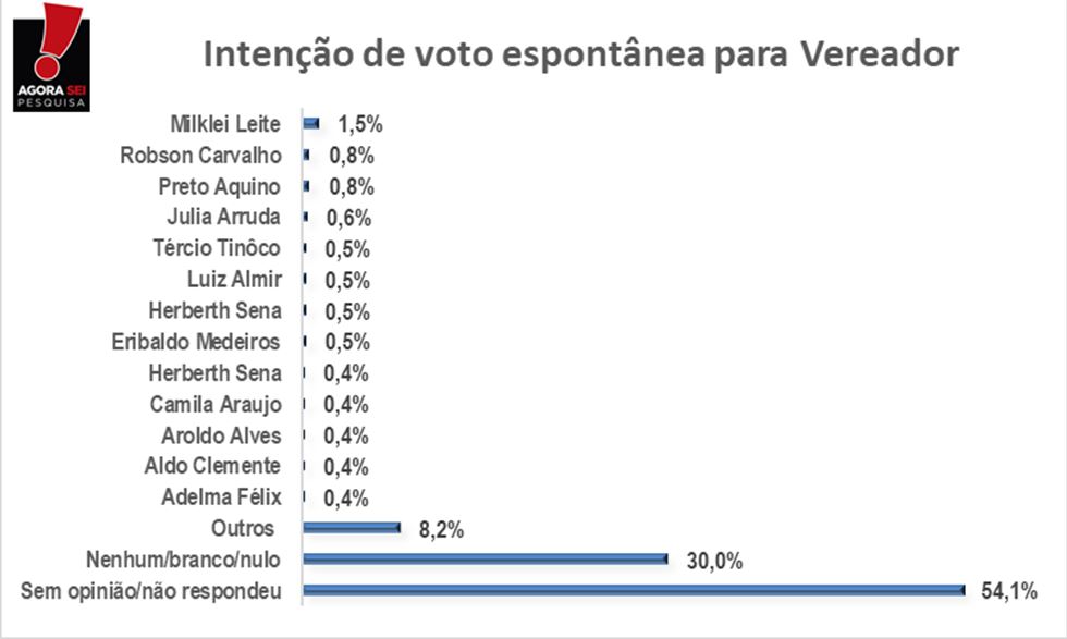 O vereador Milklei Leite foi o mais citado, com 1,5% das intenções espontâneas de voto. No levantamento, não foram citados os nomes disponíveis para o pleito. Os também parlamentares, Robson Carvalho e Preto Aquino, foram os outros dois mais mencionados.