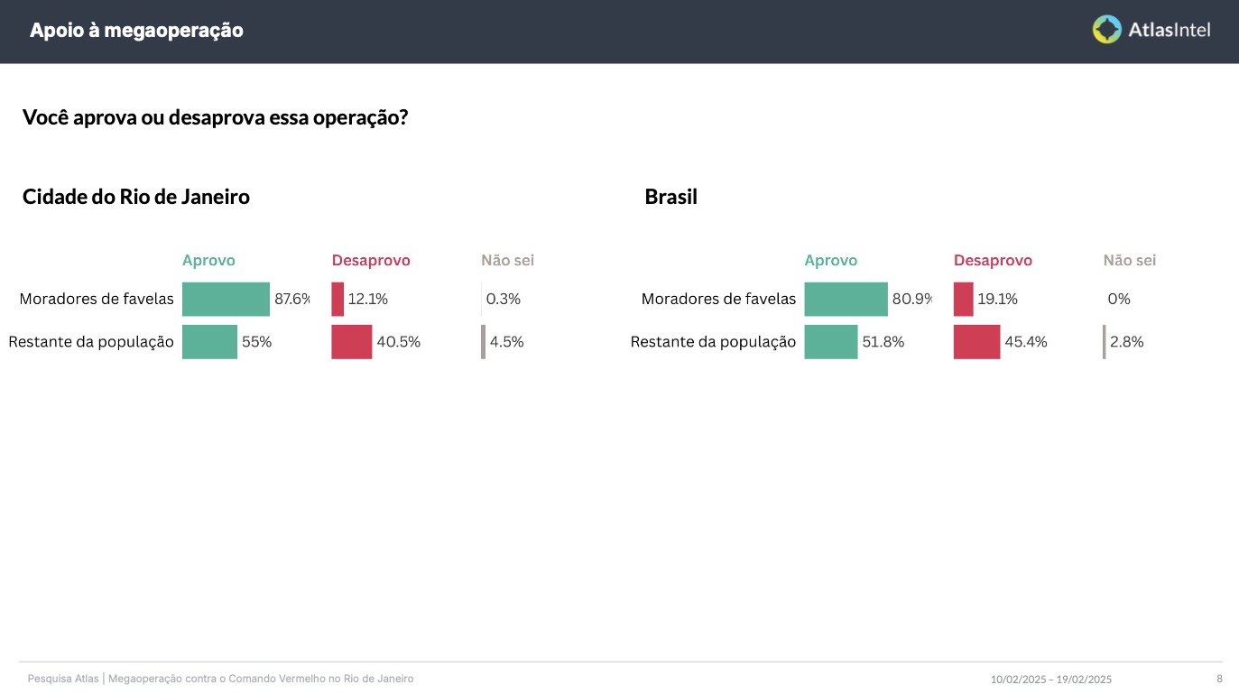 Pesquisa do instituto AtlalIntel divulgada nesta sexta-feira, 31, indica que 62,2% da população da cidade do Rio de Janeiro e 55,2% da população brasileira aprovam a Operação Contenção, deflagrada na terça-feira, 28, em resposta ao avanço do Comando Vermelho nos complexos do Alemão e da Penha. A informação é do O Antagonista.