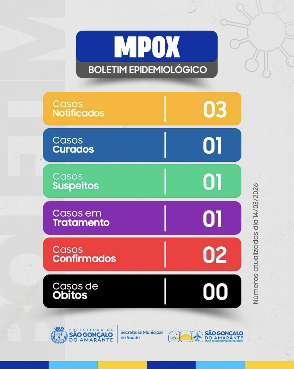 A Secretaria de Saúde de São Gonçalo do Amarante divulgou um novo boletim epidemiológico com a atualização dos casos de Mpox no município. Os dados, atualizados até o dia 14 de março de 2026, apontam três notificações da doença na cidade.