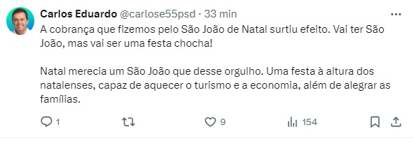 O ex-prefeito e pré-candidato a prefeito de Natal, Carlos Eduardo Alves (PSD), afirmou hoje (17) que a Prefeitura decidiu promover um São João da Capital após a cobrança pública feita por ele. A declaração foi dada pelo X, antigo Twitter.