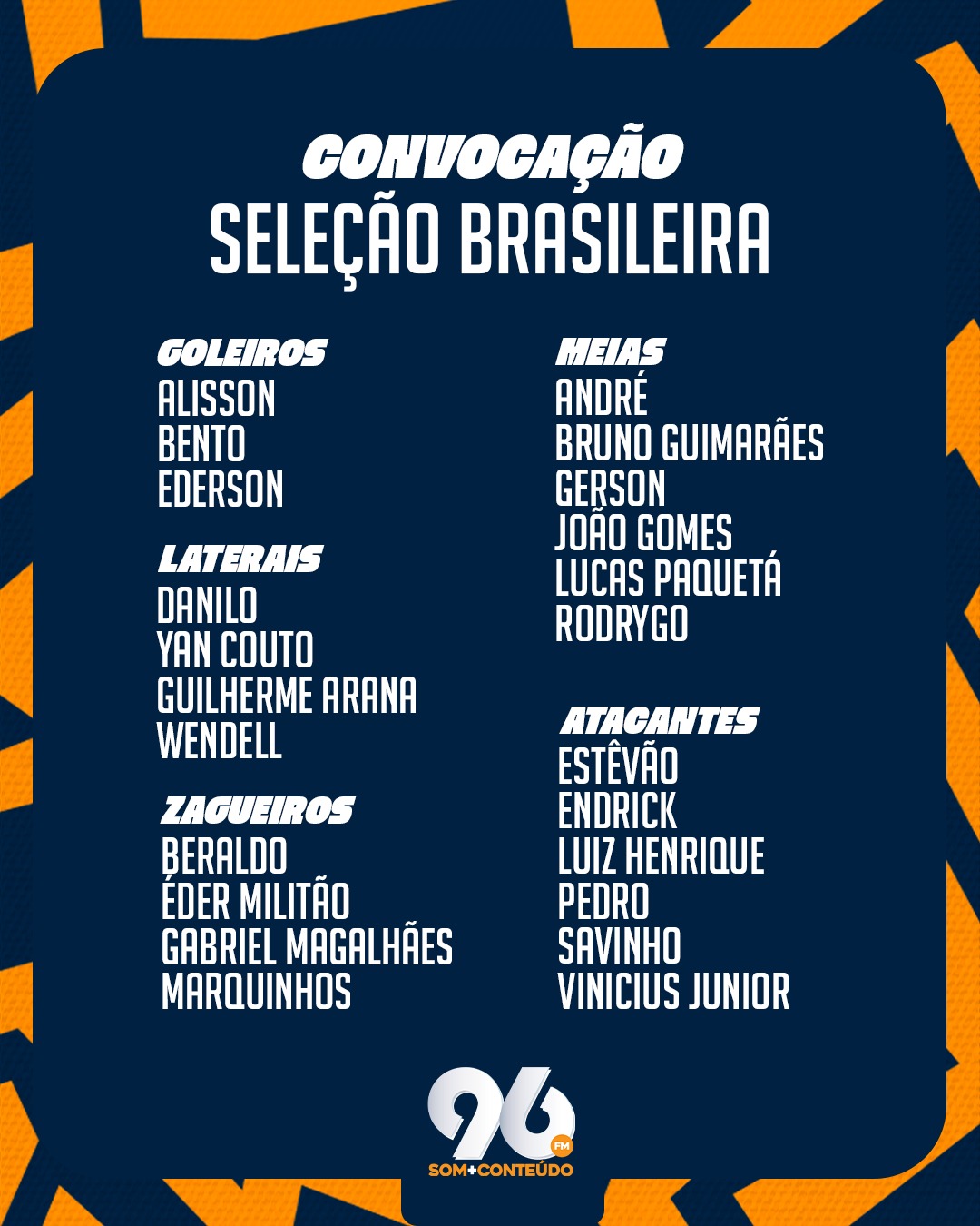 Dorival Junior anunciou na manhã de hoje, 23, a lista dos convocados para as próximas 2 rodadas das Eliminatórias da CONMEBOL para a Copa do Mundo de 2026. A 96FM Esportes transmitiu ao vivo.