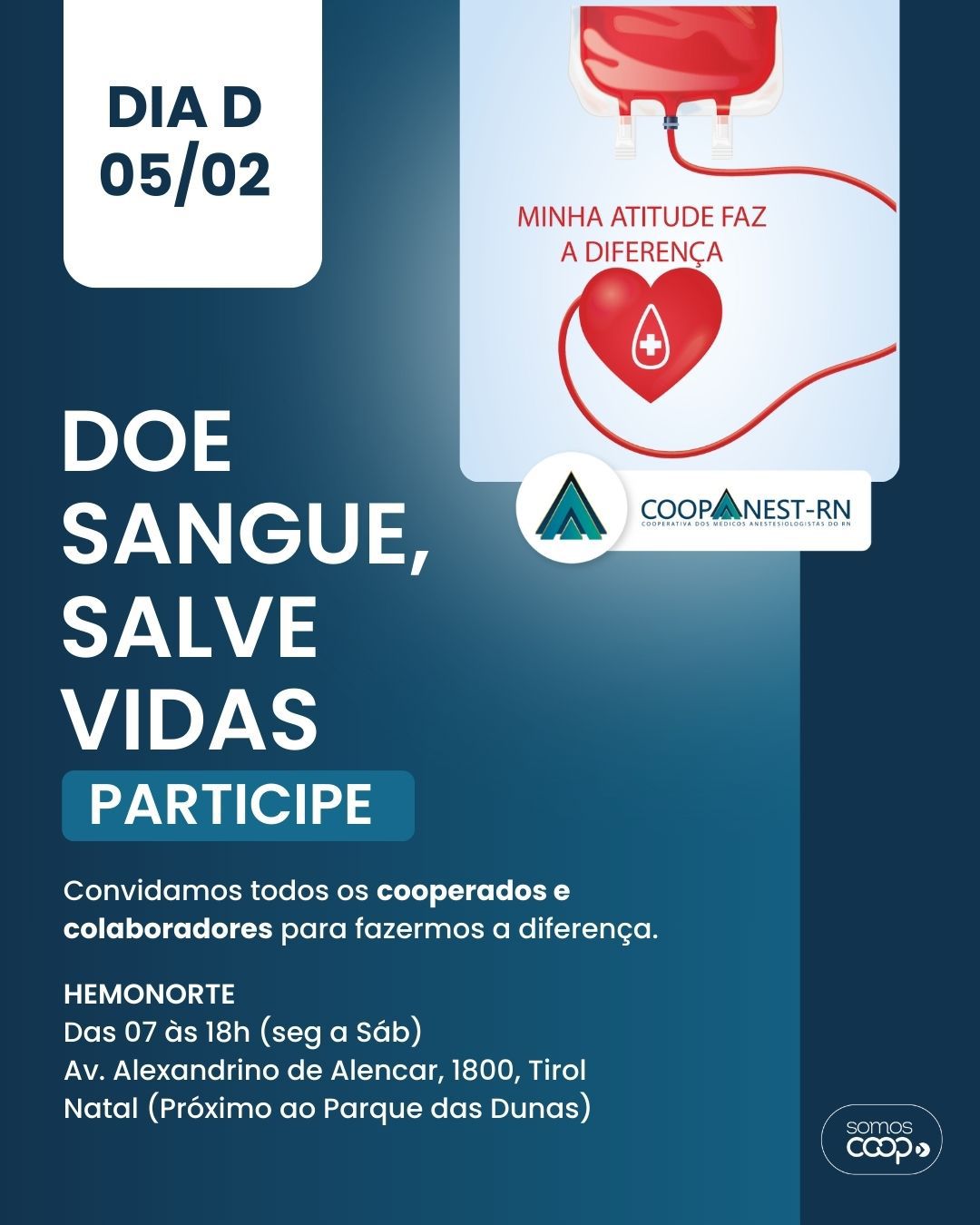 A COOPANEST-RN realiza, na próxima quinta-feira, dia 5 de fevereiro, a primeira ação de 2026 da campanha “Minha Atitude Faz a Diferença”, com mobilização para doação de sangue no Hemonorte, das 8h às 11h. A iniciativa ocorre na semana que antecede o Carnaval, período em que tradicionalmente há queda nos estoques e aumento da demanda nos serviços de saúde.
