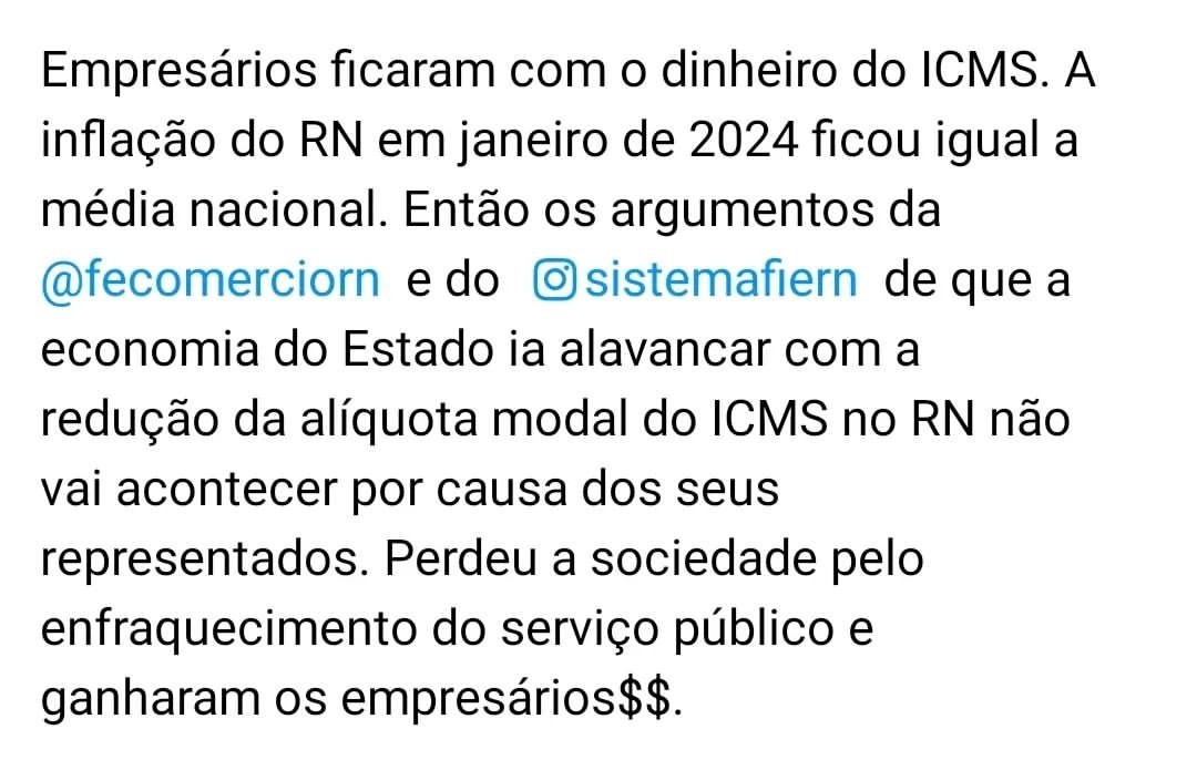 No fim de semana, pelas redes sociais, Pedro Lopes divulgou o post abaixo, acusando os empresários de ficarem com o dinheiro que "sobrou" com a redução da alíquota do ICMS. Ainda citou Fecomercio e Fiern por terem trabalhado ativamente na redução do imposto.