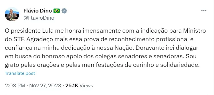 Indicado pelo presidente Luiz Inácio Lula da Silva (PT) para ocupar vaga no Supremo Tribunal Federal (STF), o ainda titular da Justiça, Flávio Dino, usou as redes sociais para agradecer o “reconhecimento profissional e a confiança” do chefe do Executivo federal.