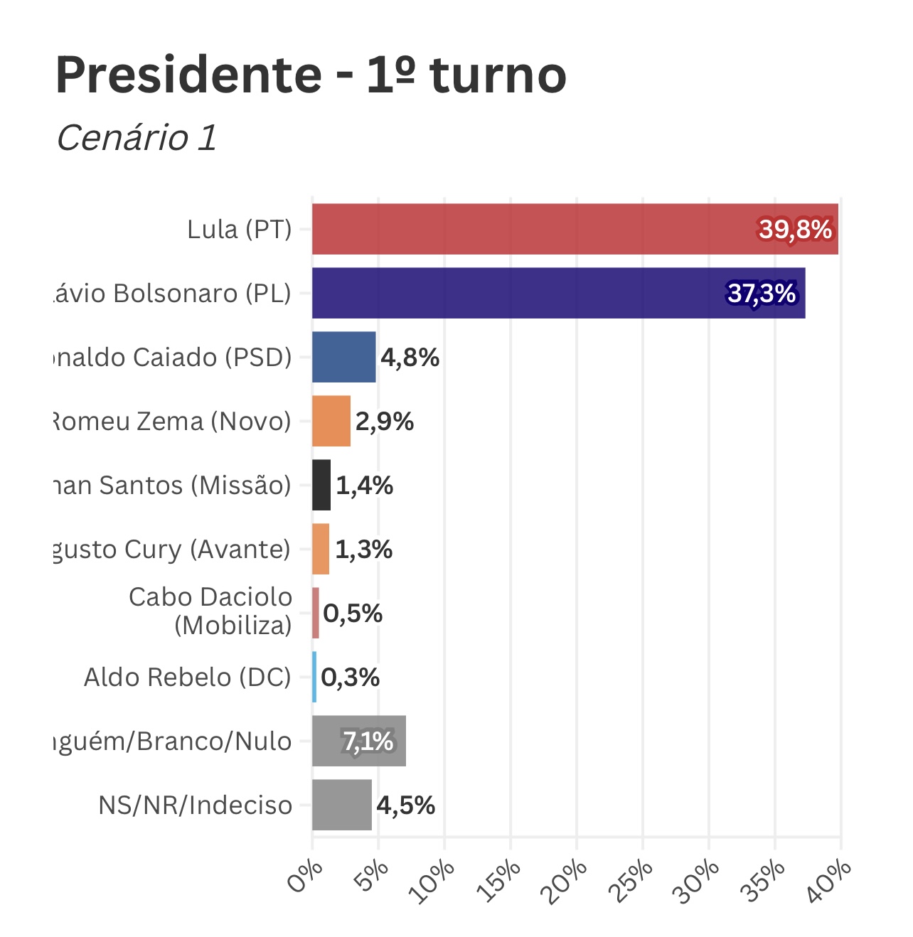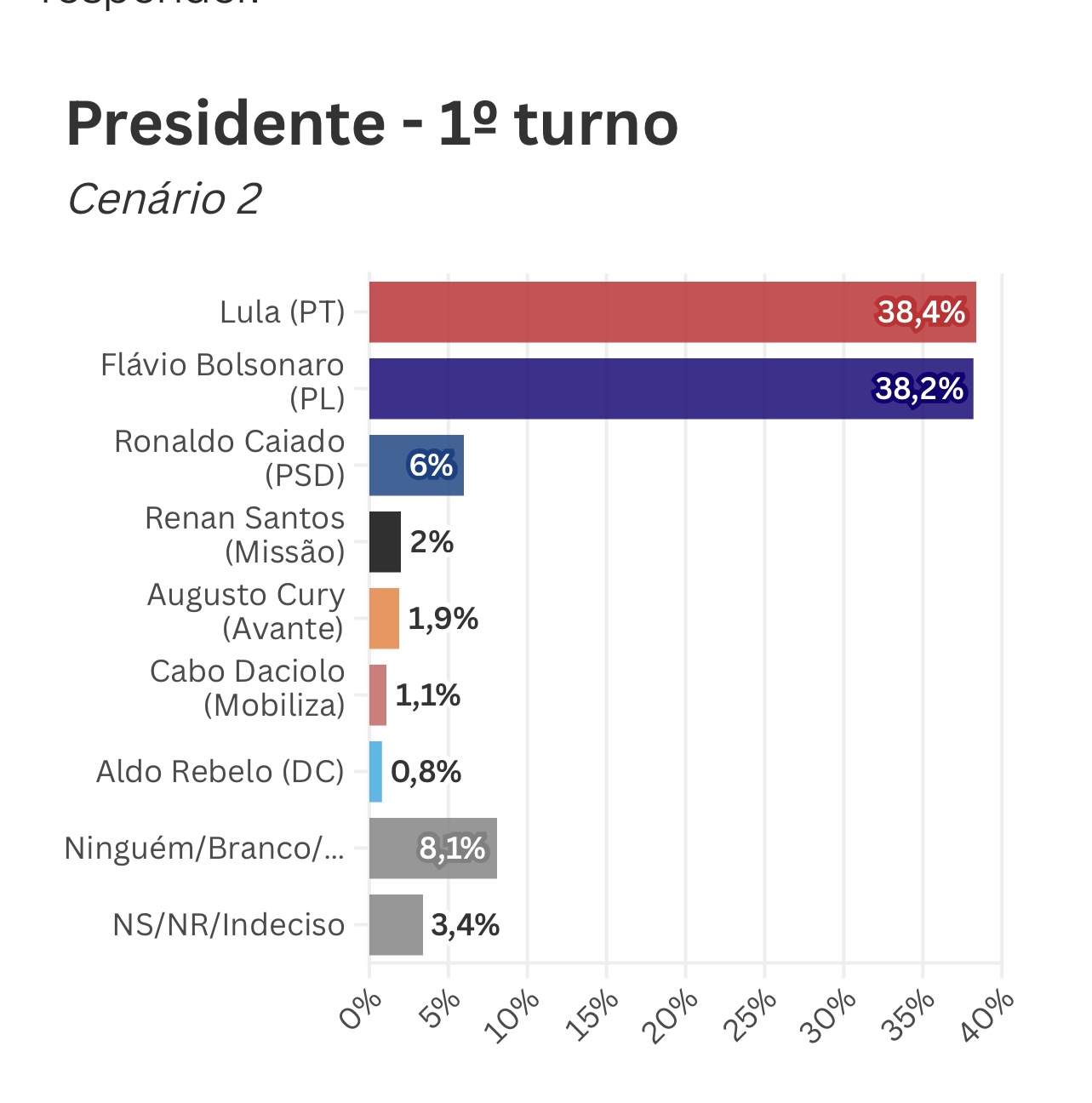 No primeiro quadro testado pelo levantamento, Lula tem 38,8% das intenções de voto, contra 37,3% de Flávio — configurando empate técnico dentro da margem de erro de 2,2 pontos percentuais, para mais ou para menos.