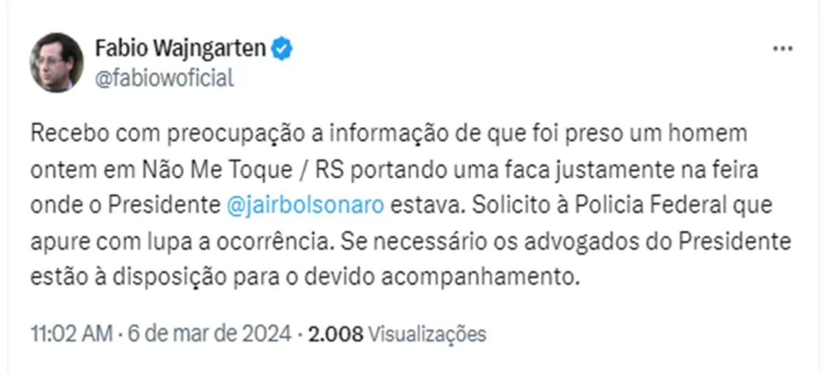 Ex-secretário de Comunicação e advogado de Jair Bolsonaro (PL), Fabio Wajngarten afirmou ter recebido a informação de que um homem foi preso com uma faca na feira em que o ex-presidente estava, nesta terça-feira (5/3). Bolsonaro foi recebido por apoiadores em Não-Me-Toque, município do Rio Grande do Sul, onde participou do Expodireto Cotrijal.