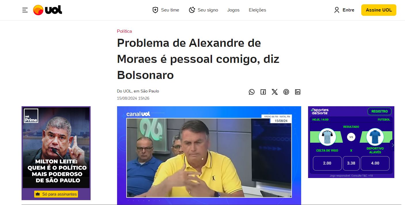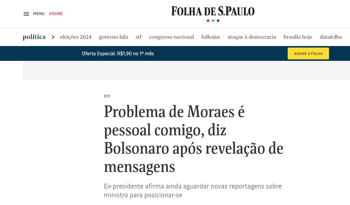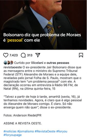A Folha de São Paulo, o UOL, a Revista Oeste e a CNN resgataram a declaração de Bolsonaro, dada com exclusividade à 96 FM, em que o ex-presidente menciona o ministro do Supremo Tribunal Federal, Alexandre de Moraes. Jair Bolsonaro afirmou que Moraes tem algum "problema pessoal" com ele, baseado nas mensagens vazadas recentemente.