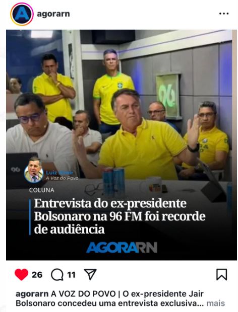 Já o noticiário local frisou o recorde de audiência da emissora no YouTube. Uma matéria publicada no Agora RN ressalta o sucesso da presença de Jair Bolsonaro na 96, que obteve mais de 9,2 mil usuários, de forma simultânea, acompanhando o programa Meio Dia RN.