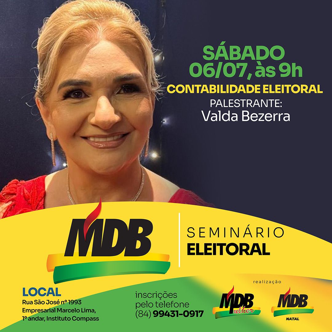 No dia 6 de julho, às 9h, o MDB Natal realizará um Seminário Eleitoral focado em contabilidade eleitoral, com a palestrante e contadora Valda Bezerra. O evento acontecerá no Empresarial Marcelo Lima, 1° andar, Instituto Compass, Rua São José, 1993.