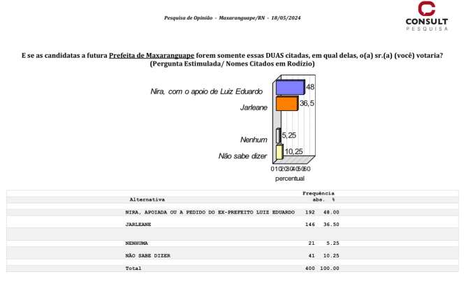 A pesquisa de registro RN-01813/2024 traz a atual prefeita, professora Nira (PSD), com 48% das intenções de voto para prefeita de Maxaranguape-RN no cenário estimulado com apoio do deputado Luiz Eduardo. A segunda colocada está com 36,5%, a ex-vereadora Jarleane Saturnino (União Brasil), tendo ainda nesse cenário 5,25% (Nenhum) e 10,25% (Não Sabe Dizer). Ou seja: a liderança chega a marca de 11,5% de diferença da atual gestora da cidade contra a pré-candidata da oposição.