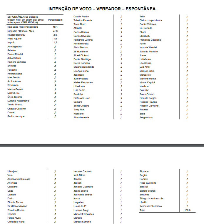 A PESQUISA SETA/ BG/ NATAL também perguntou aos entrevistados em quem votariam para vereador. Os nomes mais citados foram: Nivaldo Bacurau 2%, Preto Aquino 1,6%, Irapuã 1,2%, Anne Lagartixa 0,9%, Peixoto 0,8%, Daniel Rendal, João Batista e Raniere 0,6%. Confira lista completa abaixo.