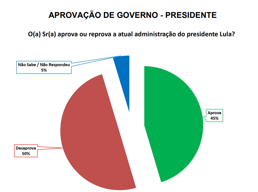 A PESQUISA SETA/ BG/ NATAL também perguntou aos entrevistados como avaliam a administração federal. O Governo Lula foi reprovado por 50%, enquanto 45% reprovam e 5% não responderam.