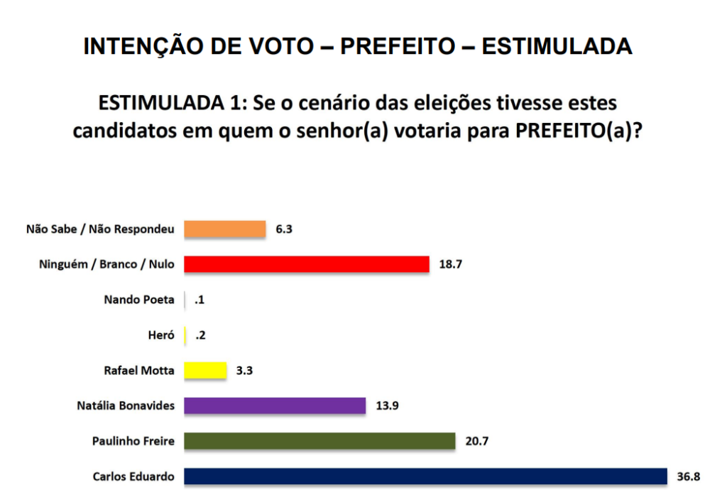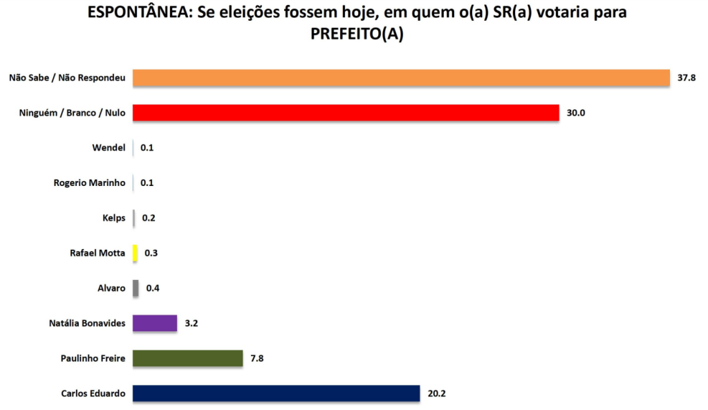 No cenário espontâneo para a Prefeitura, o ex-prefeito Carlos Eduardo lidera com 20,2% contra 7,8% de Paulinho Freire, 3,2% de Natália, Álvaro Dias 0,4%, Rafael Motta 0,3%, Kelps 0,2%, Rogério e Wendel 0,1%. 37,8% ainda não sabem em quem votar e 30% votariam nulo.