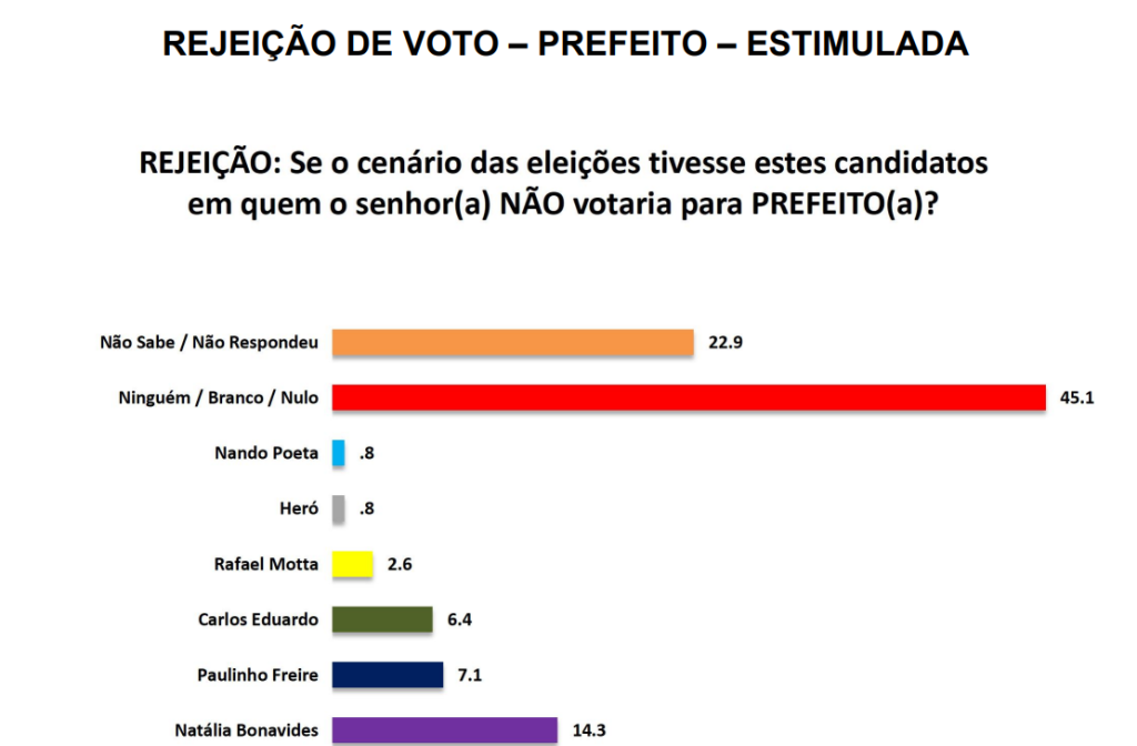 A PESQUISA SETA/ BG/ NATAL também perguntou aos entrevistados em quem não votariam de jeito nenhum. A deputada Natalia Bonavides é a mais rejeitada para 14,3%, Paulinho Freire 7,1%, Carlos Eduardo 6,4%, Rafael Motta 2,6%, Heró e Nando 0,8%. Já 45,1% votariam branco ou nulo e 22,9% não sabem.