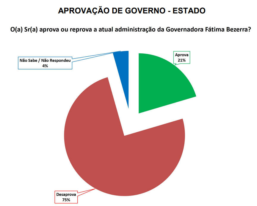 A PESQUISA SETA/ BG/ NATAL também perguntou aos entrevistados como avaliam a administração estadual. O Governo Fátima Bezerra foi reprovado por 75%, enquanto 21% aprovam e 4% não responderam.