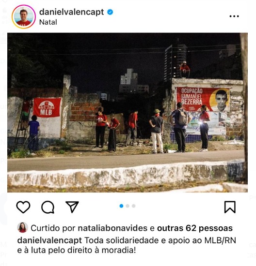 No post, Daniel Valença afirma que há uma "tentativa de criminalizar os movimentos populares de luta por moradia sempre esteve presente nos setores conservadores da sociedade brasileira. Os recentes ataques ao Movimento de Luta nos Bairros, Vilas e Favelas - MLB/RN são um capítulo de uma história de lutas."