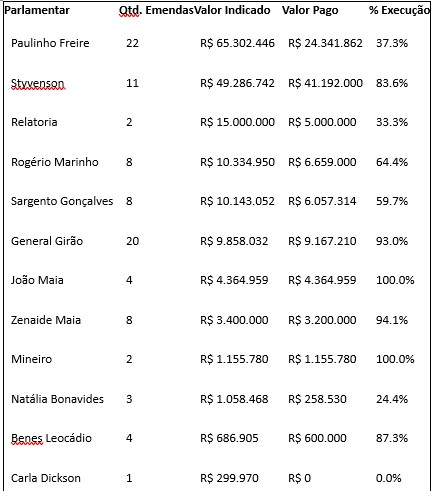 De acordo com os dados disponíveis, do total de R$ 170,8 milhões indicados, R$ 101,9 milhões — o equivalente a 59,7% — já foram pagos e estão em fase de aplicação em ações e serviços no município. Outros R$ 19,7 milhões encontram-se empenhados, com pagamento garantido, enquanto r$ 34,4 milhões aguardam a superação de cláusulas suspensivas para liberação dos recursos.